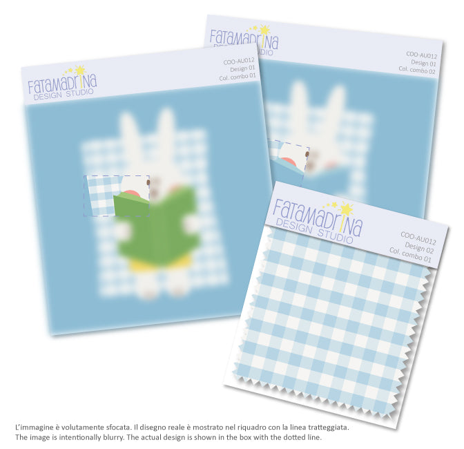 Questa grafica digitale presenta un coniglietto bianco che legge sdraiato su una coperta a quadretti. Il coordinato comprende anche un pattern a quadretti da abbinare. La grafica è tenera e moderna, perfetta per i prodotti per bambini, in particolare per quelli più piccoli.