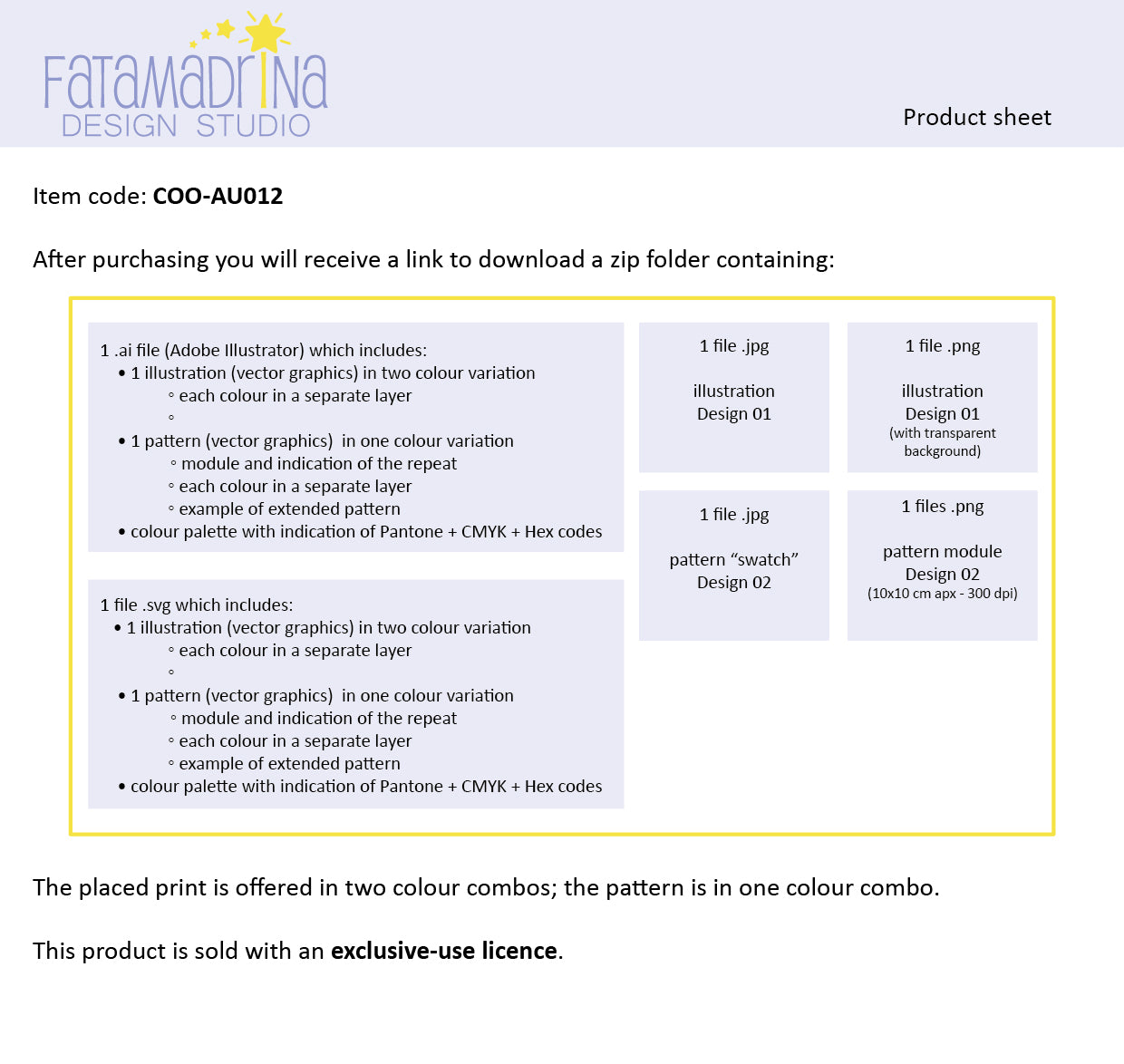 Il coordinato è proposto in due varianti colore per la stampa piazzata e una variante per il pattern. Inoltre, il file contiene la palette del tema completa e, con i colori separati per livelli, potrai adattare le varianti alle tue esigenze in modo semplice e veloce.