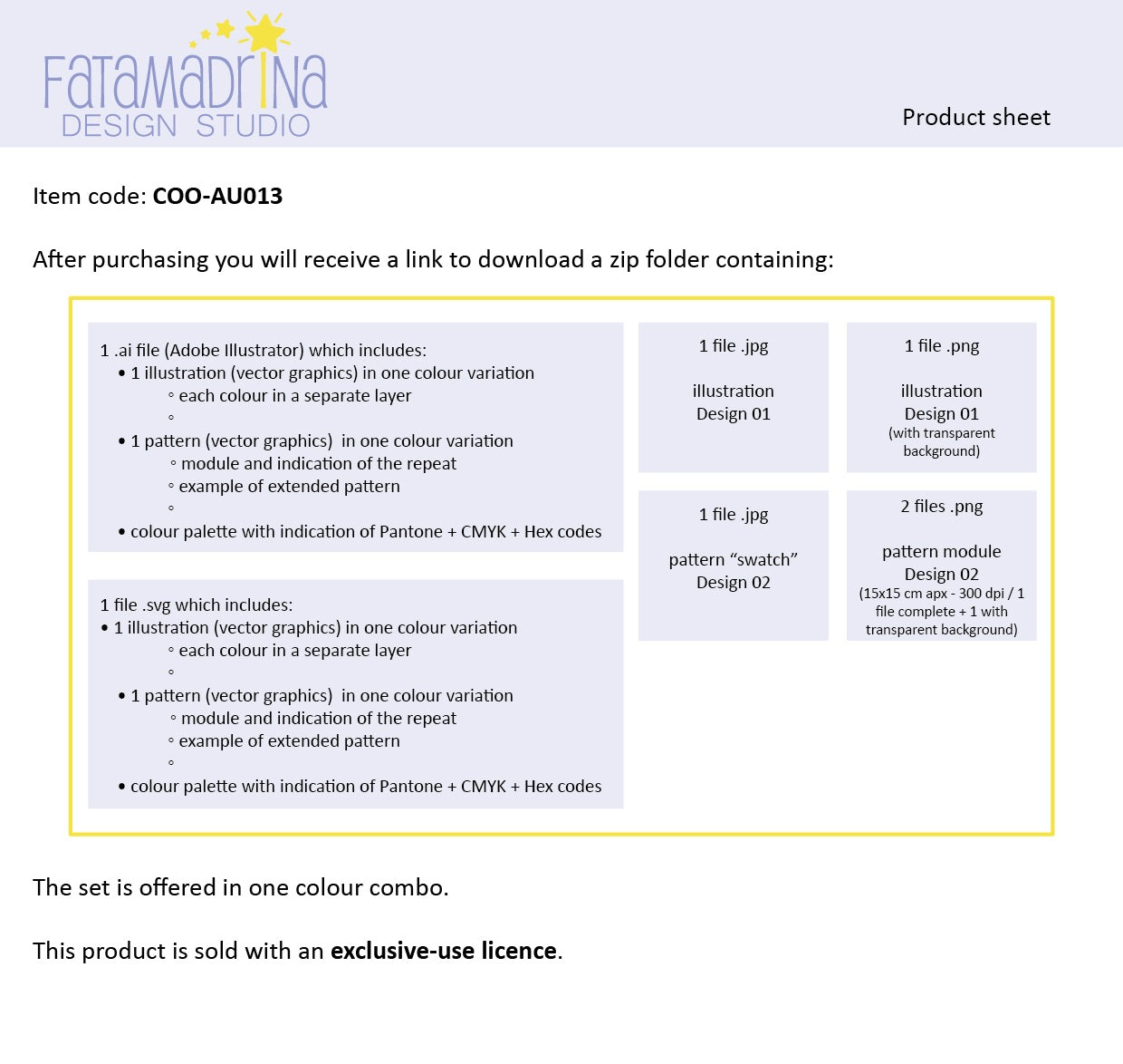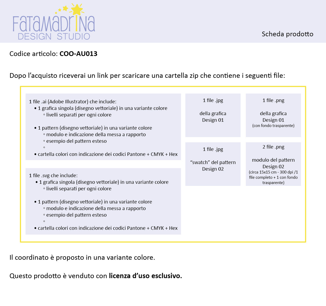 Questo prodotto è venduto con licenza d’uso esclusivo: una volta acquistato, potrai usare questo design per un tempo illimitato e in esclusiva.