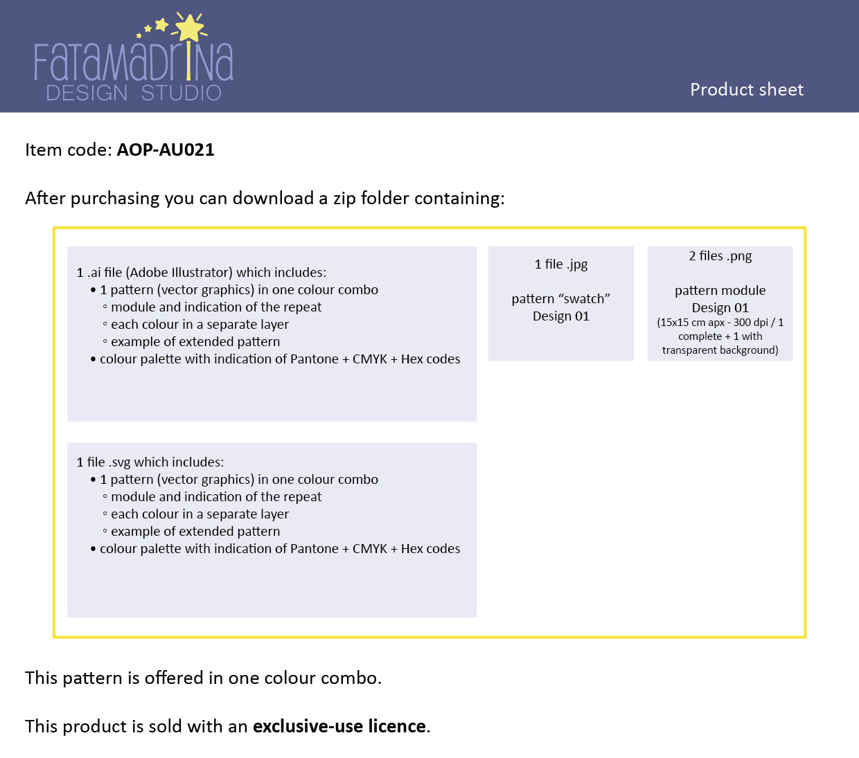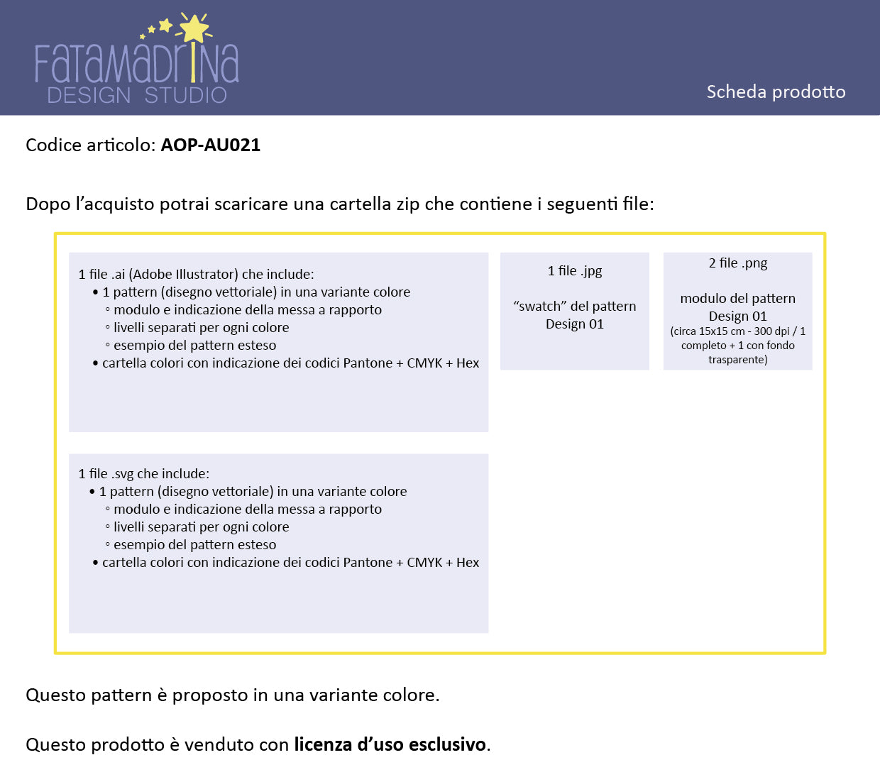 Questo prodotto è venduto con licenza d’uso esclusivo: una volta acquistato, potrai usare questo design per un tempo illimitato e in esclusiva.